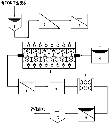 工業(yè)廢水通過廢水管線進入集水井,集水井的出口通過廢水管線連接粗格柵,粗格柵的出口通過廢水管線連接一次沉淀池,一次沉淀池的出口通過廢水管線連接pH值調節(jié)池,pH值調節(jié)池的出口通過廢水管線連接納米微孔超聲波間歇聚合反應槽,納米微孔超聲波間歇聚合反應槽的出口通過廢水管線連接二次沉淀池,二次沉淀池的出口通過廢水管線連接曝氣硝化池,曝氣硝化池的出口通過廢水管線連接生物脫氮池,生物脫氮池的出口通過廢水管線連接三次沉淀池,三次沉淀池的出口通過廢水管線連接凈水池,凈水池的出口通過廢水管線將經過本系統(tǒng)處理后的凈化出水外排;其中,納米微孔超聲波間歇聚合反應槽的槽體采用高強度玻璃鋼材質,其頂板和底板上各并排裝有8支超聲波發(fā)生器,槽體中部設有上、下兩道不銹鋼網狀龍骨,分別用于固定上、下兩組納米微孔表面聚合體,兩組納米微孔表面聚合體中央安裝了6支攪拌槳葉,槽體左側設有進水閥門,右側設有出水閥門;經過酸化的工業(yè)廢水通過納米微孔超聲波間歇聚合反應槽左側的進水閥門進入反應槽內部,16支超聲波發(fā)生器開始工作,發(fā)出超聲波,廢水中的有機物在超聲波協同化學效應的作用下,在納米微孔表面聚合體的表面發(fā)生C-H鍵的短暫斷裂,由于納米微孔表面聚合體材料中添加有能夠催化聚合反應進行的氯化烯丙基鈀二聚物,在其催化聚合作用下,已經斷裂的C-H鍵會迅速在納米微孔表面聚合體的納米孔隙處發(fā)生C-H鍵的再結合,從而在納米微孔表面聚合體的表面發(fā)生聚合反應,超聲波發(fā)生器開啟一定時間后即停止工作,同時兩組納米微孔表面聚合體中央的6支攪拌槳葉同時開始攪拌以產生液體湍流作用,這會使剛剛形成的有機物聚合體的分子量不斷增大,逐步匯聚成大顆粒的不溶物質并從納米微孔表面聚合體表面脫落,以懸浮物的形式分散于廢水中,并隨廢水通過反應槽右側的出水閥門排出反應槽,進入二次沉淀池,并最終通過沉淀過程從廢水中加以除去,同時,納米微孔超聲波間歇聚合反應槽中的攪拌槳葉停止工作,超聲波發(fā)生器重新開啟,并通過進水閥門重新注入廢水,開始新一輪催化聚合反應過程,如此往復循環(huán);其中,pH值調節(jié)池的作用是將經過一次沉淀的廢水pH值調節(jié)至1.5~3.0,以滿足納米微孔超聲波間歇聚合反應槽的入水pH值要求;其中,曝氣硝化池的作用是通過好氧曝氣過程,使廢水中的各種含氮物質均轉化為硝酸鹽氮;其中,生物脫氮池的作用是通過生物活性反應過程,將廢水中的硝酸鹽氮分解轉化,從而去除硝酸鹽氮。
