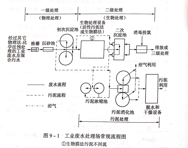 為達(dá)到國(guó)家污水排放標(biāo)準(zhǔn),一般的廢水處理場(chǎng)都采用一級(jí)處理(物理法或化學(xué)法)、二級(jí)生物法處理的處理流程(見圖9-1),為避免工業(yè)廢水水質(zhì)不均衡引起對(duì)出水水質(zhì)的影響,在二級(jí)生物法處理前后分別設(shè)置均質(zhì)調(diào)節(jié)池(事故池)和監(jiān)測(cè)池。