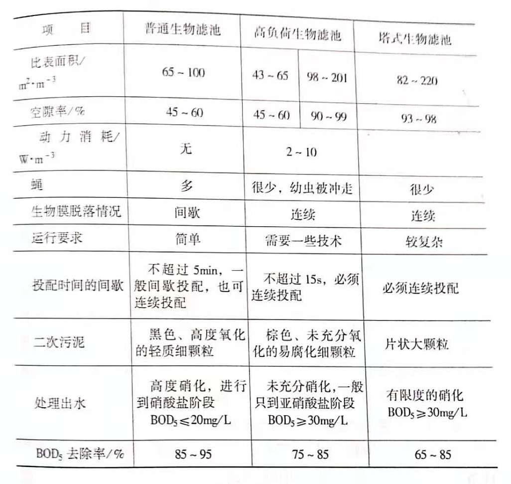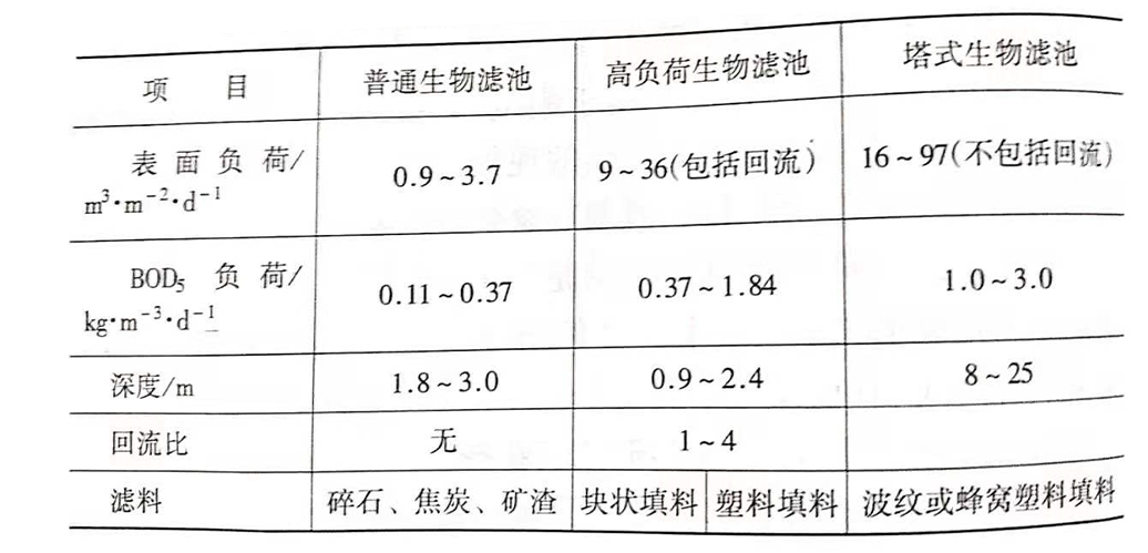 常見的生物濾池有普通生物濾池、高負荷生物濾池和塔式生物濾池等三種,下面的表格列出了這三種生物濾池的基本參數(shù)。